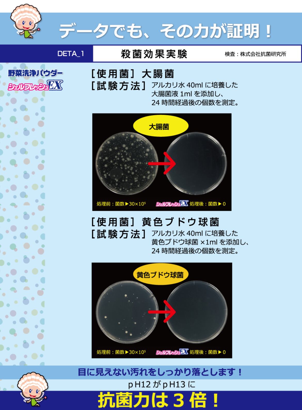 ●ホタテの貝殻成分から生まれた天然素材100%の野菜・果物剥離洗浄・除去剤です