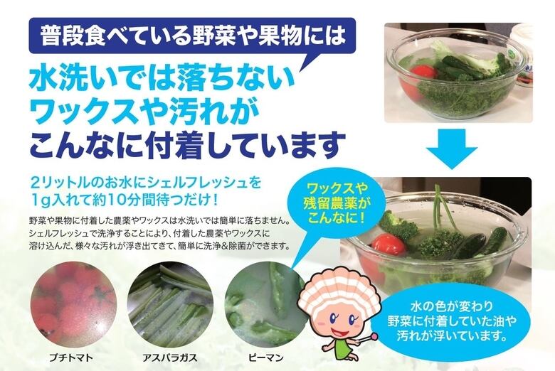 ホタテの貝殻のみで作られた、野菜・果物の洗浄パウダー