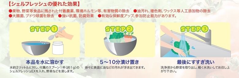 野菜や果物の表面に付着した残留農薬や雑菌などをつけ置き洗いとすすぎ洗いで簡単に落とします。