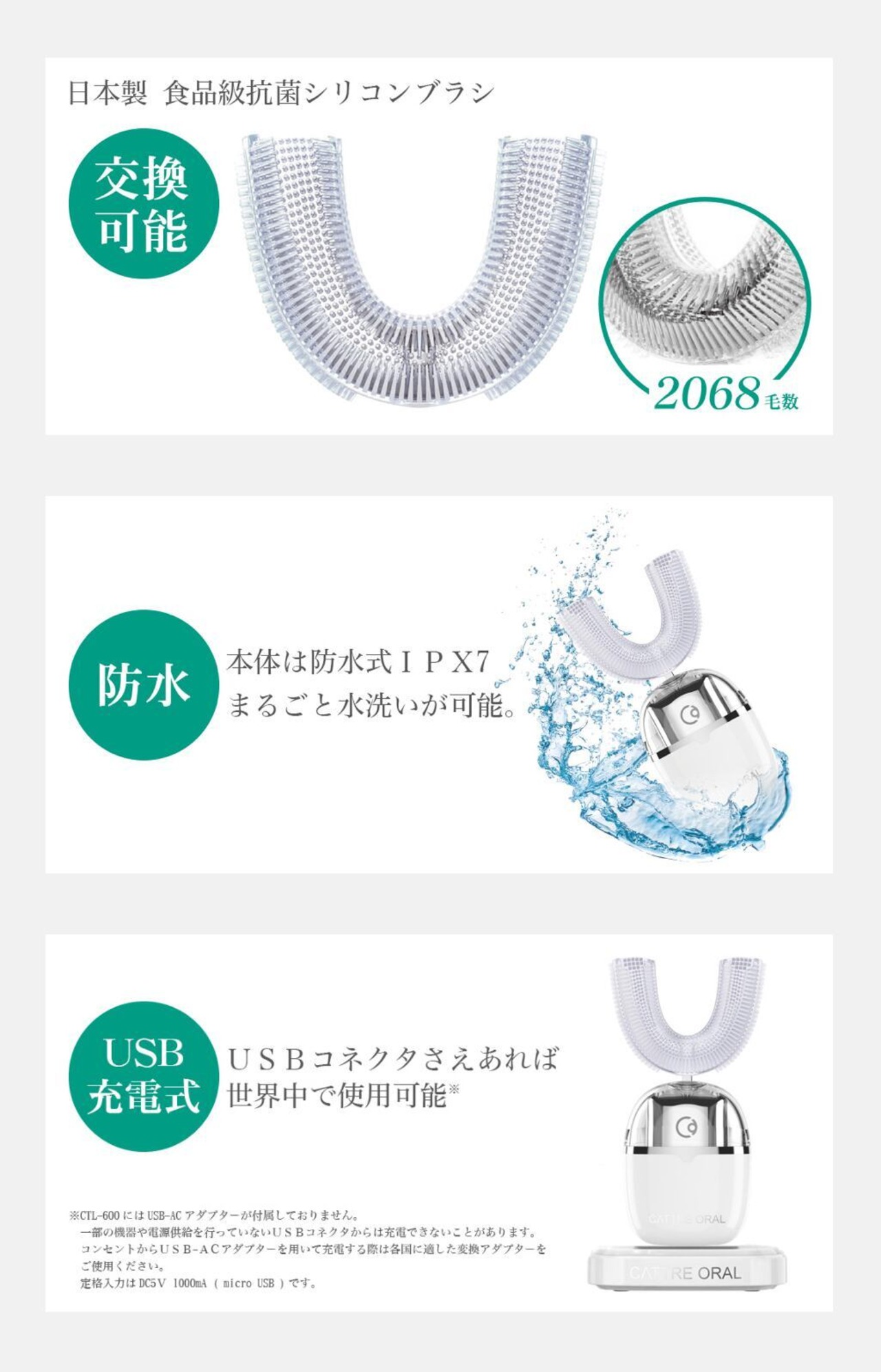 2068本の日本製シリコンブラシヘッドが歯の隅々までフィットし、口腔内を洗浄します。